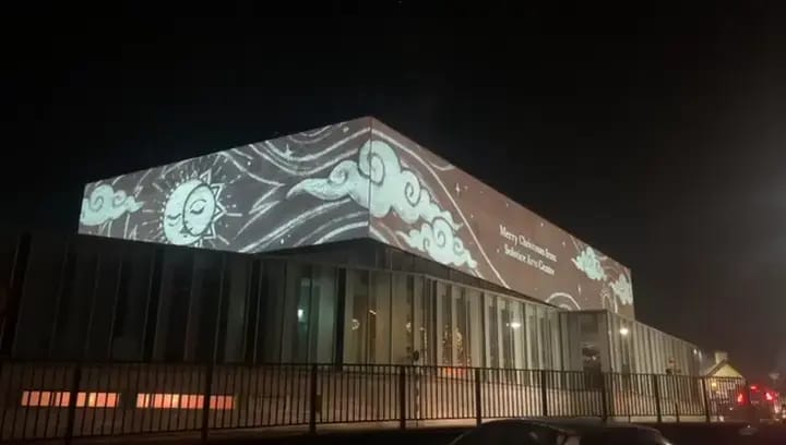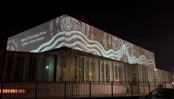 As part of a seasonal installation for the Solstice Arts Centre, I delivered a large-scale water screen projection on the River Boyne in Navan. The project served as a striking visual centrepiece in the lead-up to Christmas, captivating audiences with vibrant, animated content projected directly onto a mist screen over the water.