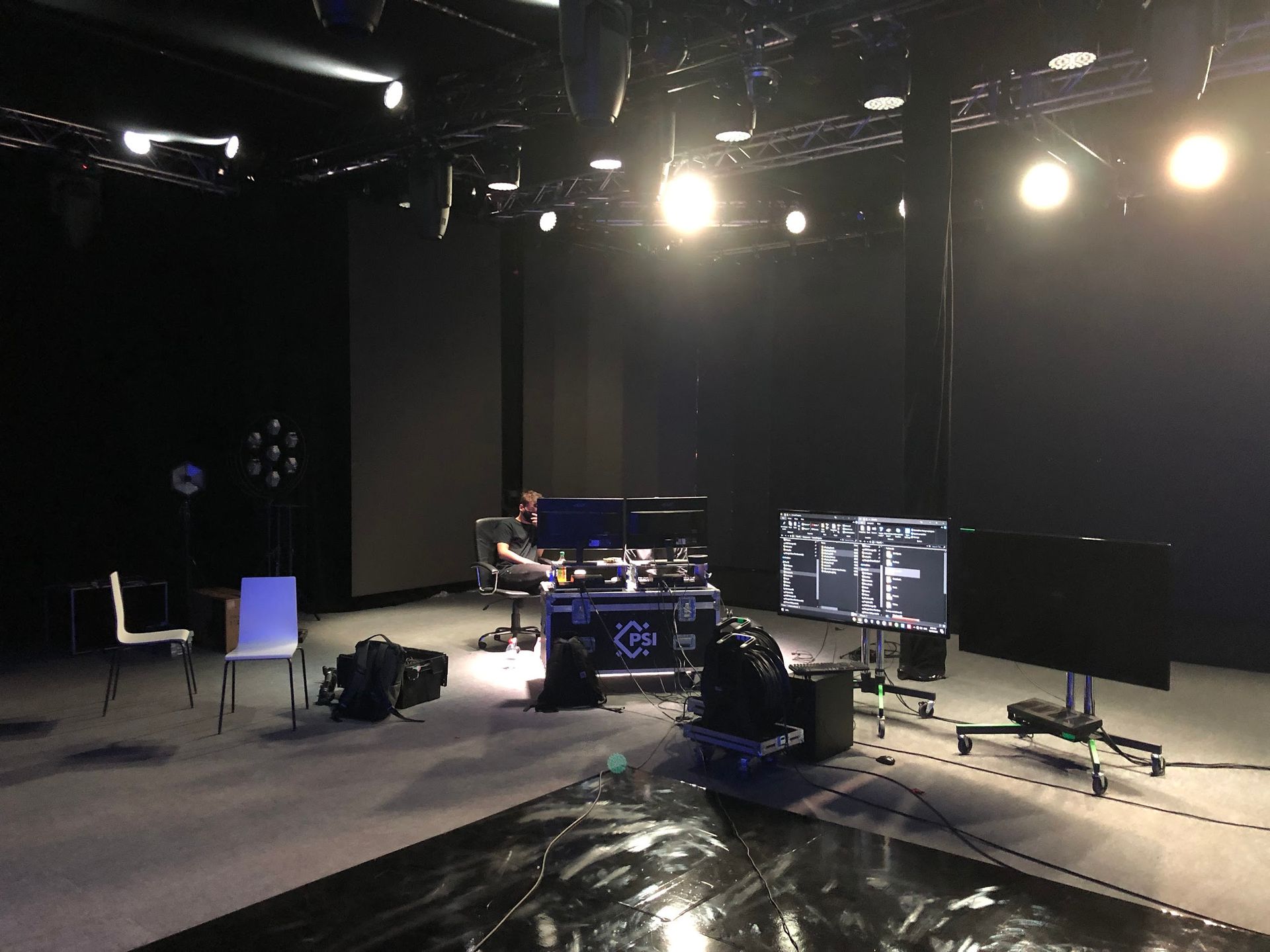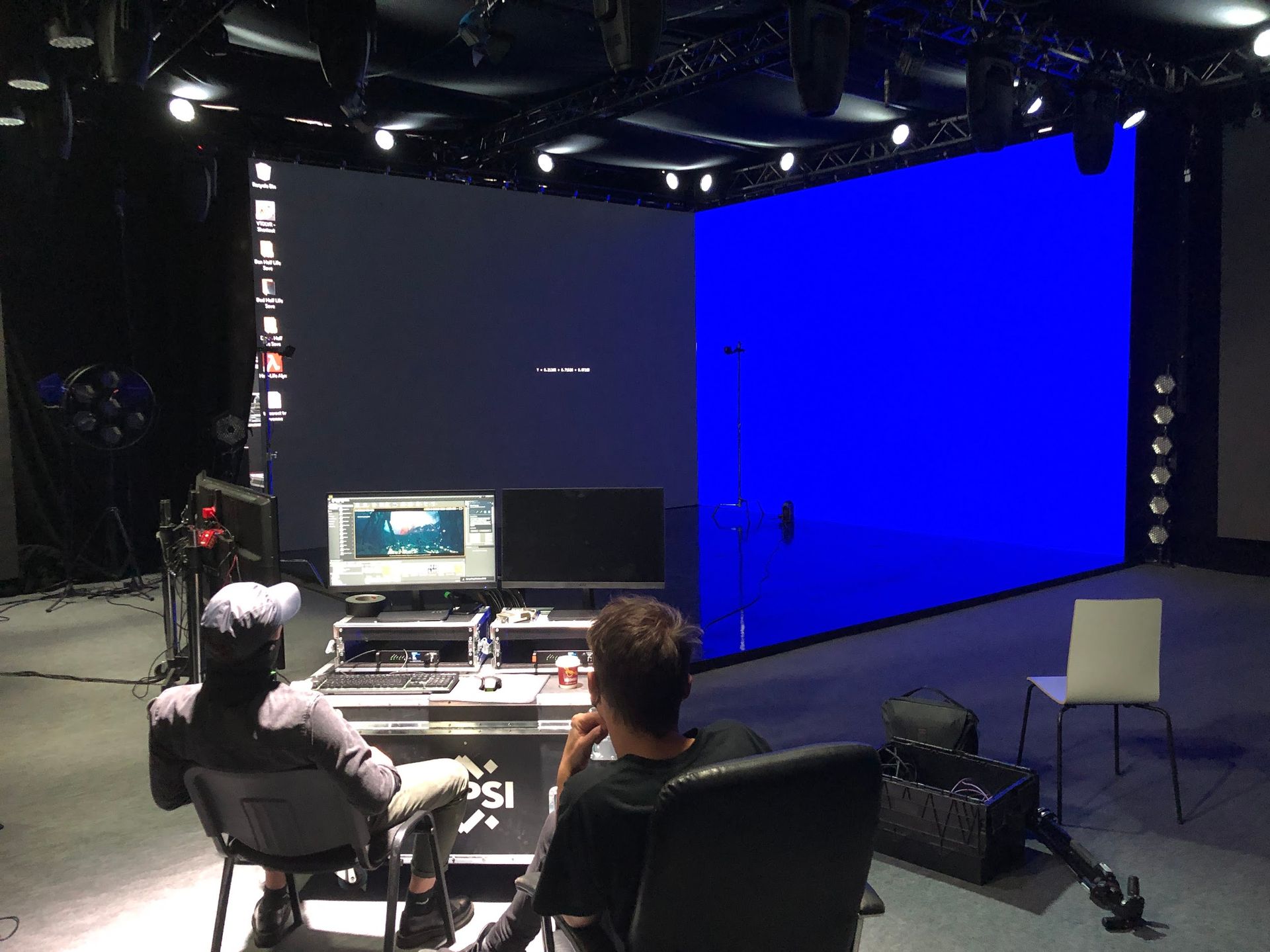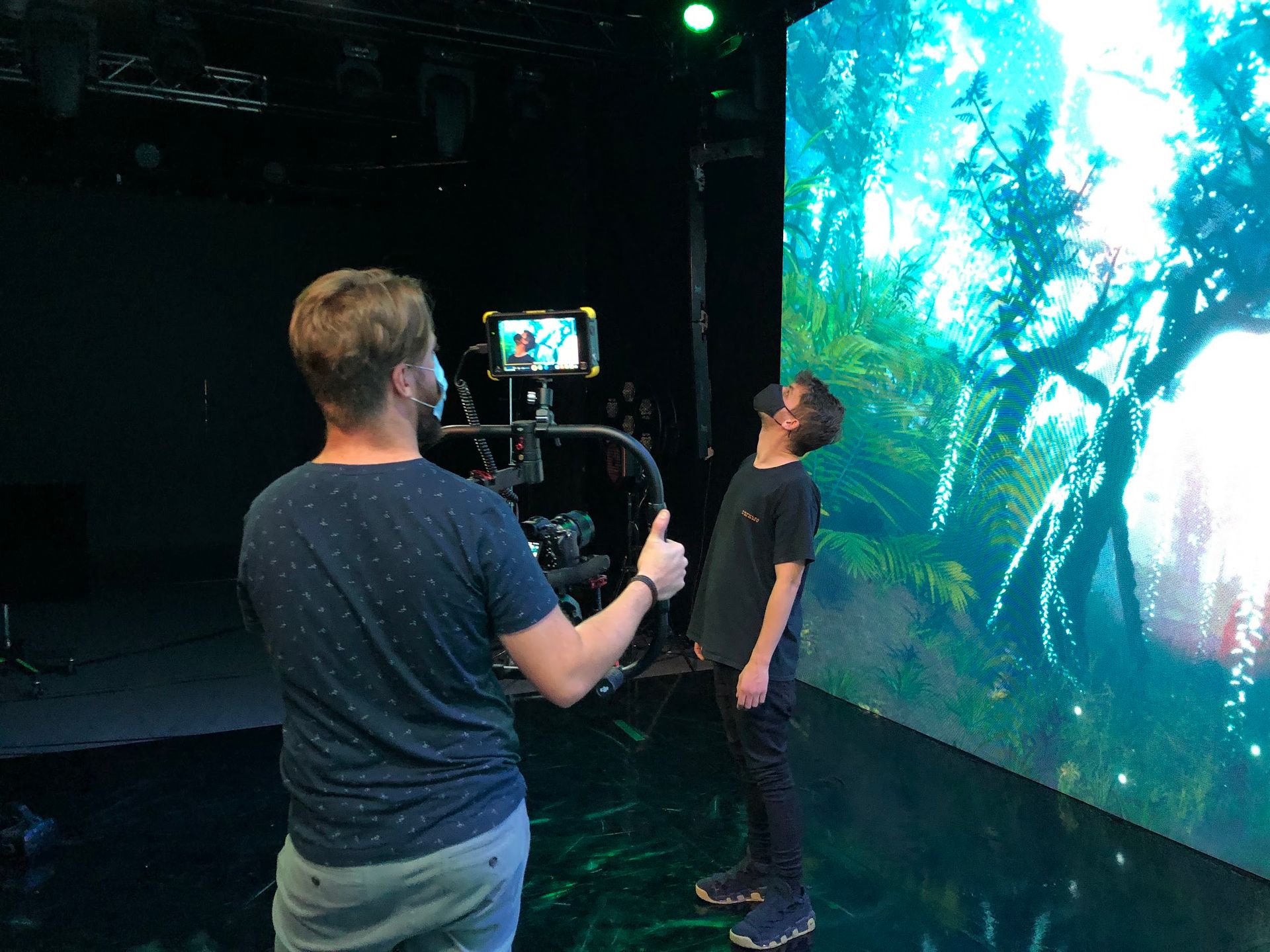 We built a custom setup using an L-shaped LED wall and a tracked camera system powered by VR trackers, allowing us to render parallax-accurate backgrounds in real time via Unreal Engine. This setup enabled us to test virtual set extensions and lighting interactions on a small scale, simulating the kind of workflows used in high-end film and TV production.
