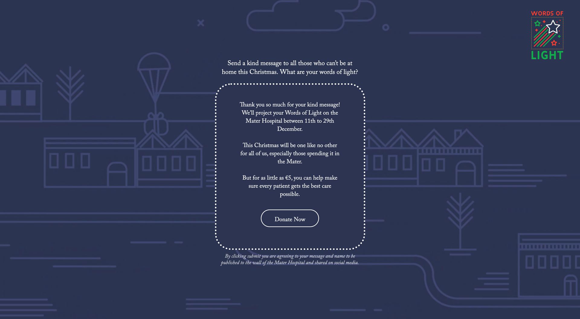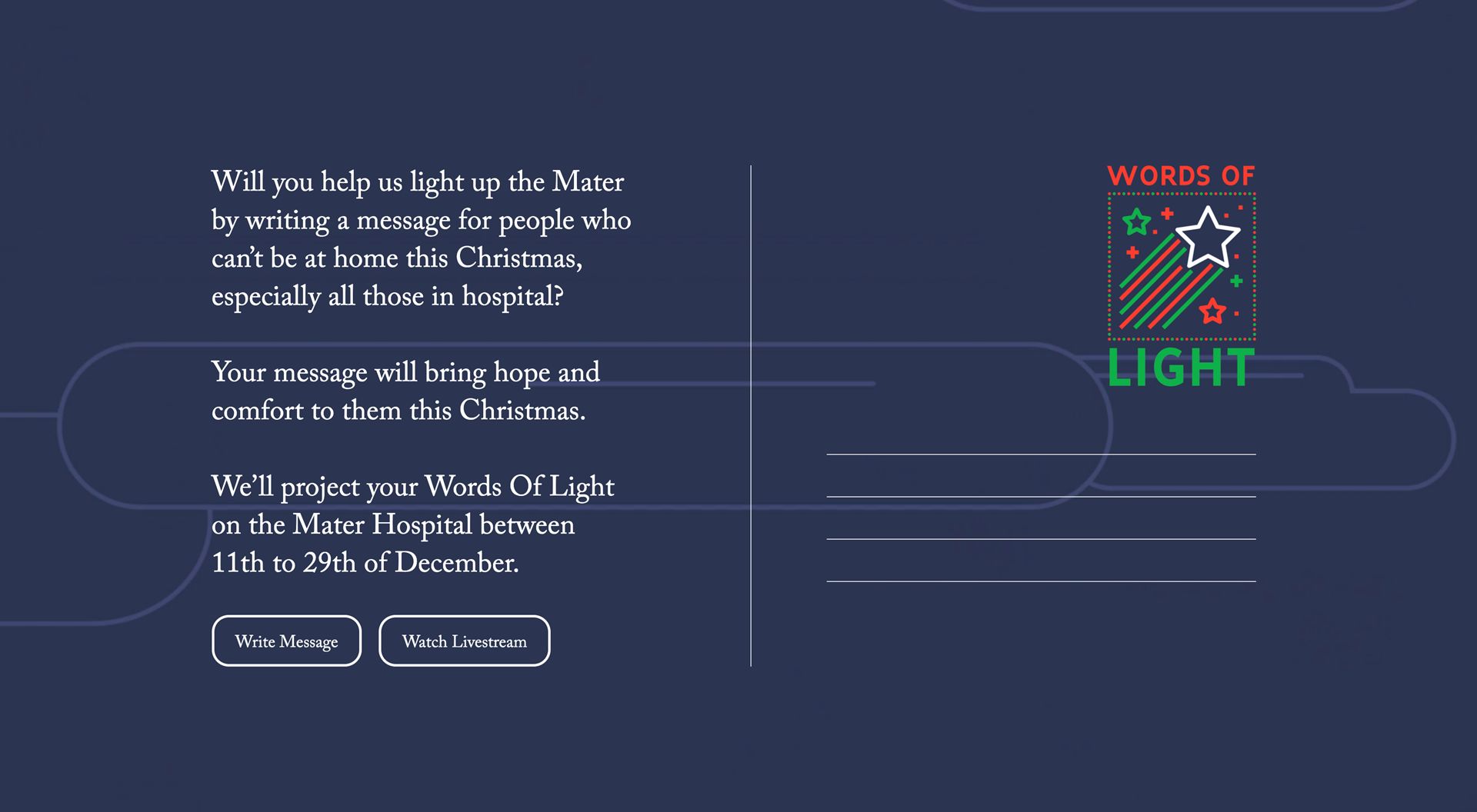 The result was a meaningful and community-driven installation that lit up the side of the Mater Hospital each night with warm, personal messages—offering comfort and connection during a time when many were apart from loved ones.